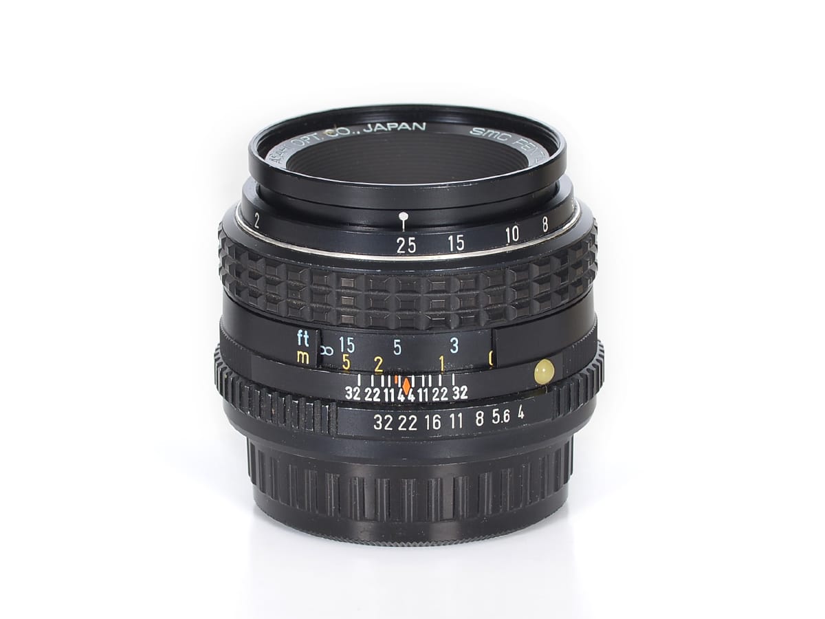 Noin 0,8-kertainen (äärettömään tarkennetulla 50 mm:n objektiivilla, −1,0 m-¹)